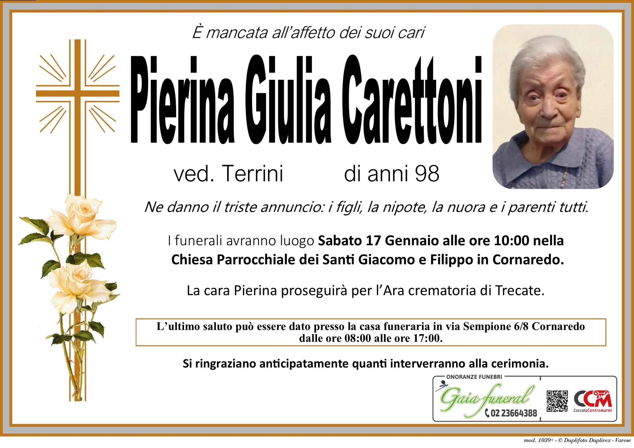 È mancata all’affetto dei suoi cari Pierina Giulia Carettoni vedova Terrini di anni 98.