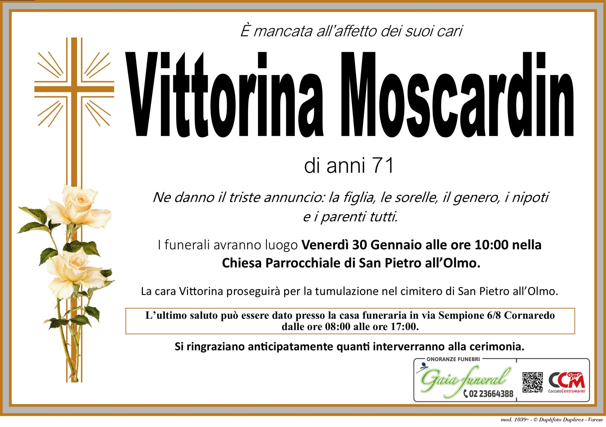 È mancata all’affetto dei suoi cari Vittorina Moscardin di anni 71.